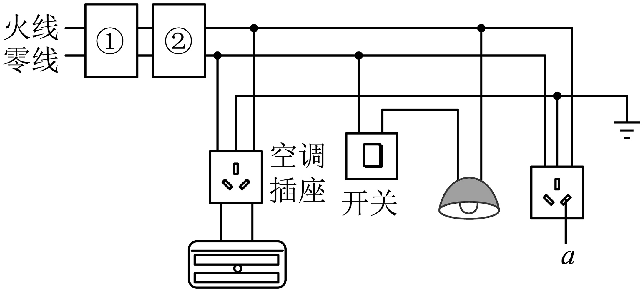 5、如图所示是小科家室内安装的带有漏电保护器的空气开关、三孔插座等设备的配电系统。(1)、图中灯泡与插座的连接方式是;(2)、①②两处需接入空气开关和电能表,则①处应接;(3)、用试电笔接触a孔中金属片,氖管发光。(选填“会”或“不会”) 。