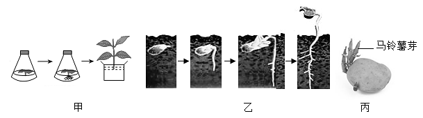 15、下图表示植物的几种繁殖过程,表述错误的是( )A、甲表示组织培养,能在较短的时间内大量、快速地繁殖植物 B、乙表示双子叶植物种子萌发的过程 C、丙中的马铃薯利用块茎进行繁殖的方式属于营养生殖 D、植物组织培养、种子繁殖均属于有性生殖