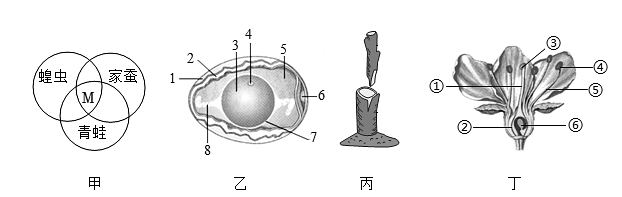 3、下面是部分生物的生殖和发育过程相关示意图,请据图回答下列问题(1)、图甲中M代表的发育方式是。这三种生物个体发育的起点都是。家蚕的生殖发育过程中,为提高蚕丝产量,应延长的发育时期是期。(2)、图乙为受精的鸡卵结构图,[]是鸡卵最重要的部分,将来能发育成雏鸡。(3)、图丙所示繁殖方式成功的关键是将接穗和砧木的紧密结合。我们平时所食用的桃肉甘甜多汁,实际是由图丁中的[②]发育而来的。