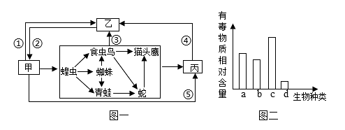 5、伊川县荆山森林公园冬夏长青,四季花妍。这里生活了各种各样的生物,还有土壤、水、阳光、空气等非生物,它们共同组成了一个生态系统。图一为该生态系统的碳循环示意图,其中甲、乙、丙为生态系统的部分组成成分,①~④表示生理过程;图二表示该生态系统中四种生物体内有毒物质的相对含量。回答下列问题:(1)、图一中,表示生产者的是(填“甲”“乙”或“丙”),可以通过[②](生理过程)合成有机物,消费者通过③呼吸作用消耗有机物,产生二氧化碳,具有促进生态系统的作用。(2)、若图二中的a、b、c、d四种生物构成了图一中一条完整的食物链,则d对应的生物处于第营养级,c对应的生物为。(3)、该生态系统中能量的最终来源是。