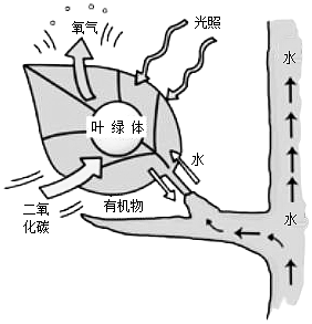 19、如图所示为绿色植物的叶片进行某些生理活动的示意图。下列叙述不正确的是( )A、图中所示的生理活动是植物的光合作用 B、叶绿体是光合作用的场所,光照是光合作用的条件 C、和水一起被根吸收并向上运输的还有有机物 D、这个生理活动产生了新的物质,属于化学变化