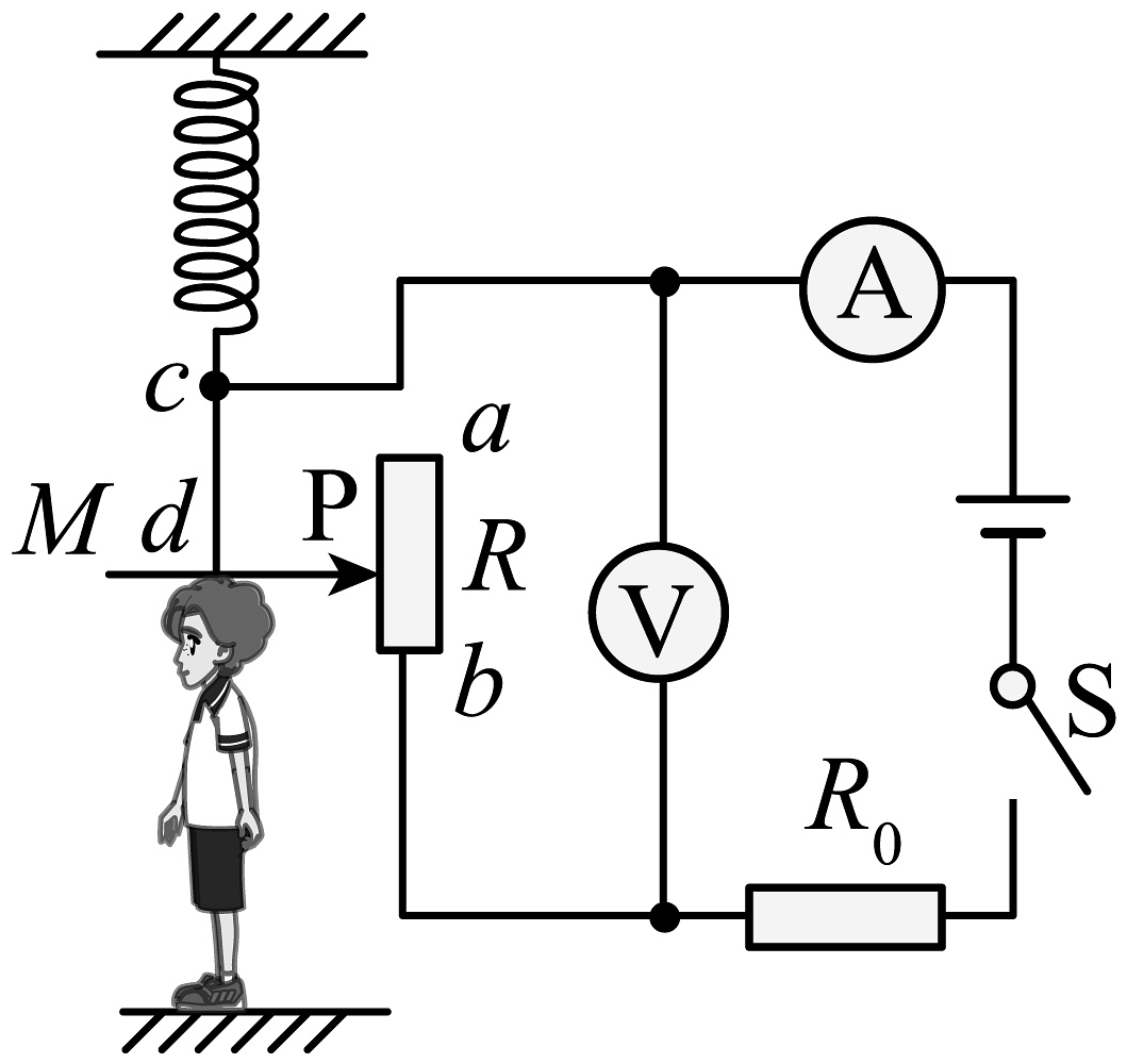 7、参加全国青少年创新大赛,小强运用电学知识设计了一个电子身高测量仪,如图所示。其中定值电阻R0=5Ω,电源电压恒为4.5V,R是固定的、竖直放置的硬电阻棒,总长为30cm,总电阻为15Ω,其接入电路的电阻与接入电路的棒长成正比,金属杆cd和MP右端P与电路接触良好。(1)、R0在电路中的作用是;(2)、当被测身高增加时,电压表的示数 , 电流表的示数;(选填:变大/变小/不变)(3)、小强身高为170cm,用该测量仪测量时,电流表示数为0.5A,此时电阻棒R接入电路的电阻为多少Ω?(4)、若电压表量程为0~3V,电流表量程为0~0.6A,为了保证电路各元件安全工作,该电子身高测量仪能测量的最大身高是多少cm?