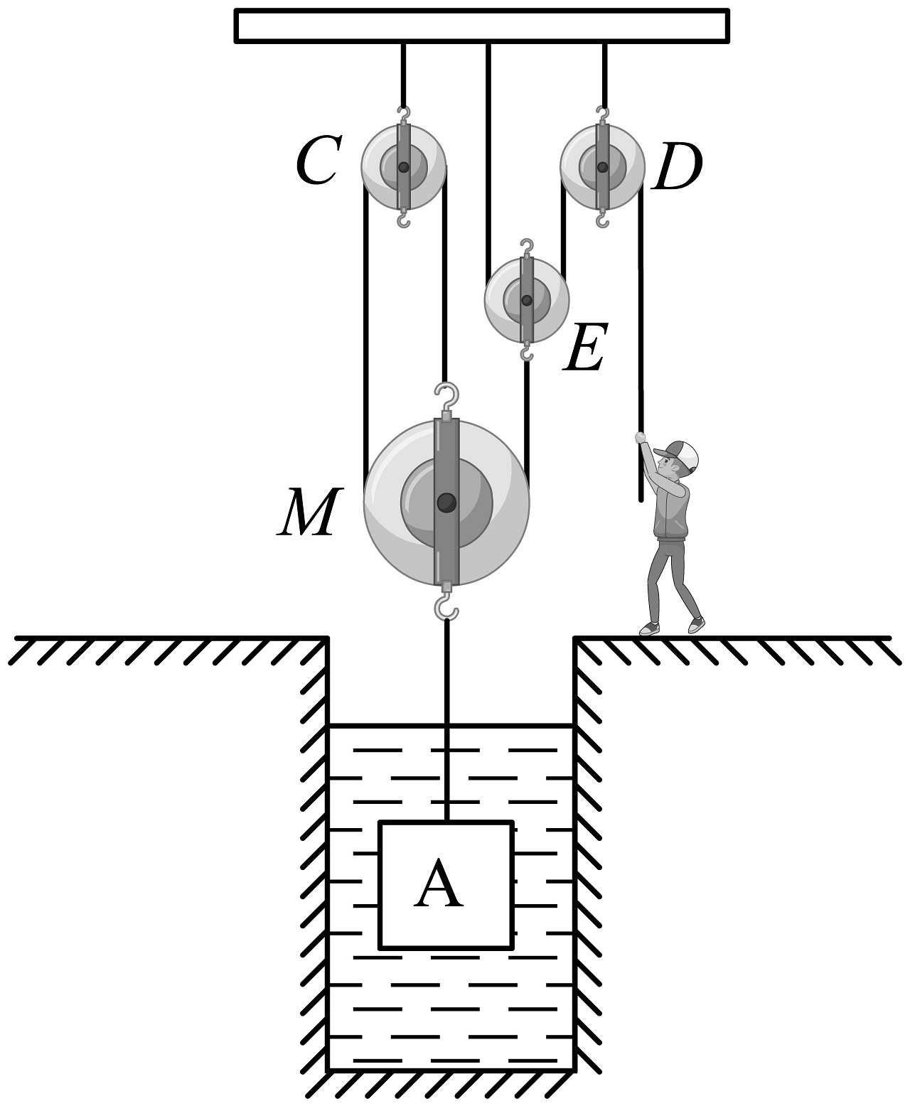 3、工作人员用如图所示装置打捞水中的物体。第一次提体积的物体A在水中匀速上升的过程中(A未露出水面),人对绳子竖直向下的拉力为 , 人拉力的功率为 , 绳端的速度为 , 机械效率为;第二次提重为的物体B在水中匀速上升的过程中(B未露出水面),人对绳子竖直向下的拉力为 , 人拉力的功率为 , 绳端的速度为 , 机械效率为。已知:功率 , , 物体A、B的体积 , 重力 , 四个滑轮质量相等,忽略绳重,绳与滑轮间摩擦及液体对物体的阻力。下列说法正确的是( )A、物体A在水中所受的浮力 B、物体B在水中所受的浮力 C、动滑轮的重为15N D、速度、的比值为2:3