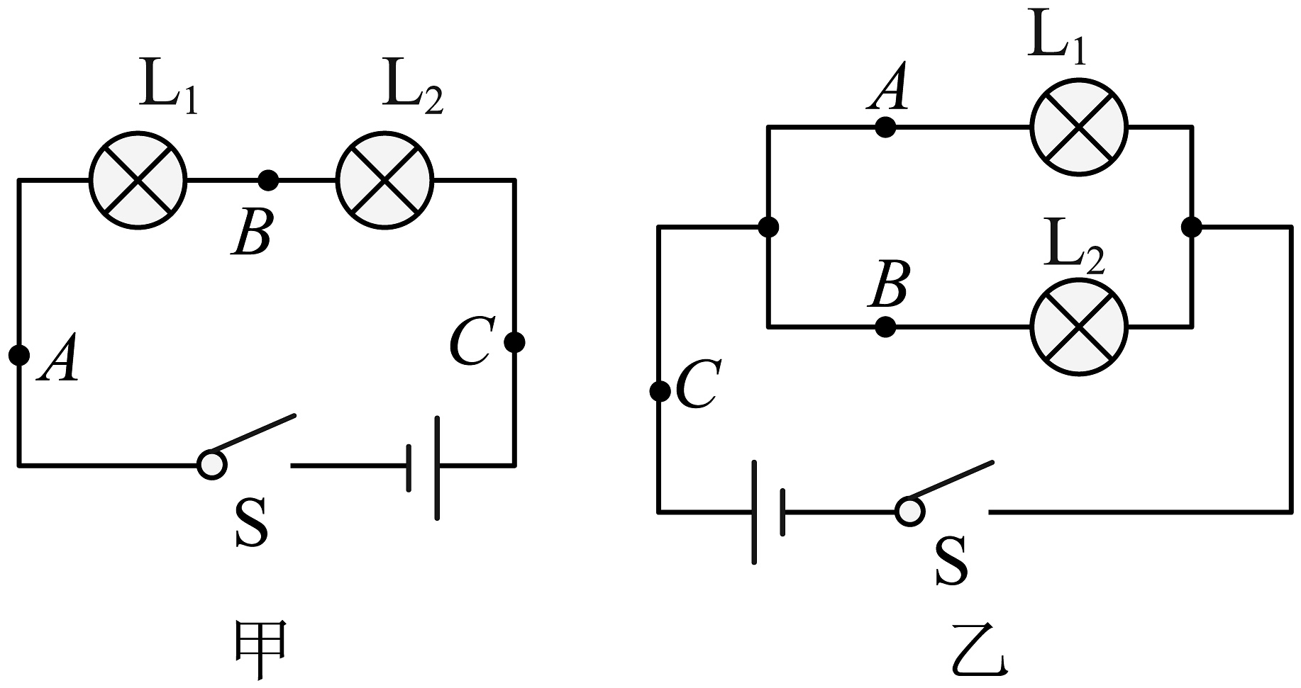 (3)、通过实验能初步得到的结论是。(4)、为了进行新的探究,小武同学做如下操作:①将器材按图乙连接;②分别测A、B、C三点的电流,并记录在表格2中;③分析表格2的实验数据,立即得出结论。请你指出小武在实验设计中存在的问题:。修正方案后继续实验,并归纳得出并联电路中干路电流和支路电流的关系:(写出关系式即可)。