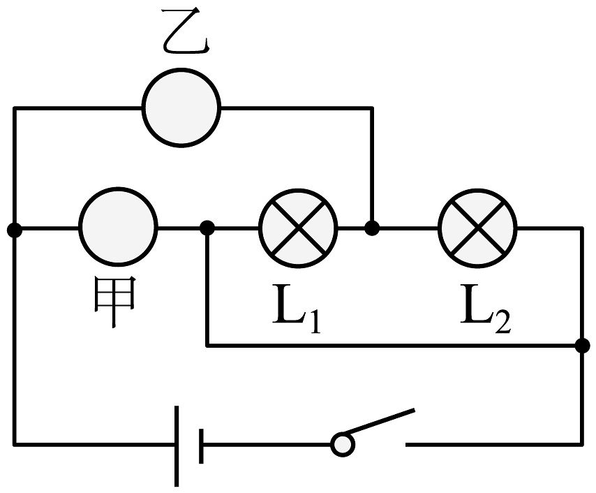 5、如图所示,闭合开关,要使两灯泡并联,下列说法正确的是( )A、甲是电流表,乙是电压表 B、甲是电压表,乙是电流表 C、甲、乙都是电流表 D、甲、乙都是电压表