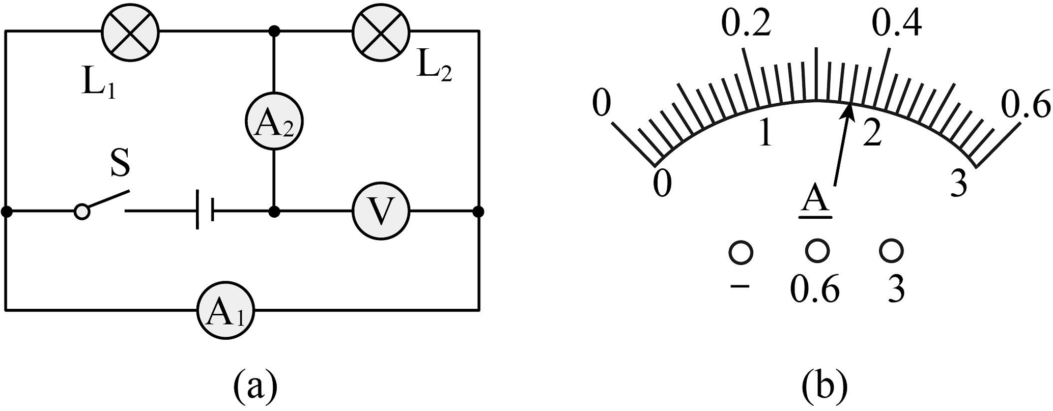 1、如图(a)所示的电路中,当S闭合后,两个电灯均发光且两个电流表的指针均如图(b)所示,则L1中的电流为A,L2中的电流为A。若电压表的示数为2.8V,则电源电压(大于/等于/小于)2.8V。