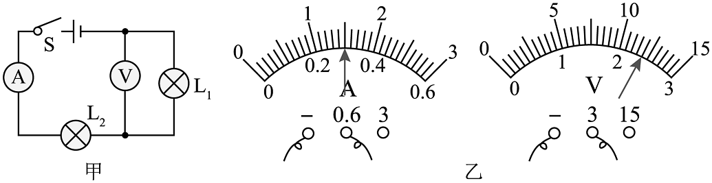9、在如图甲所示的电路中,当开关闭合时,电流表、电压表示数如图乙所示,电源由四干电池串联而成,每一节干电池的电压是1.5V,那么:(1)、通过灯泡和的电流分别为多少?(2)、灯泡两端的电压是多少?(3)、灯泡两端的电压是多少?