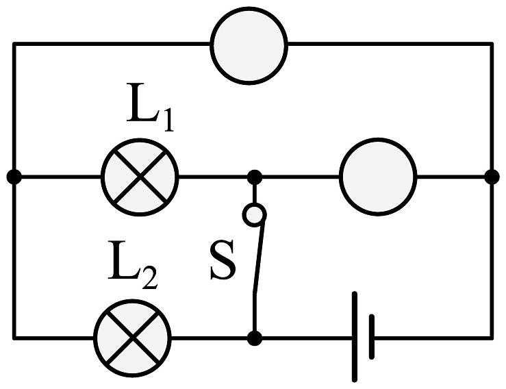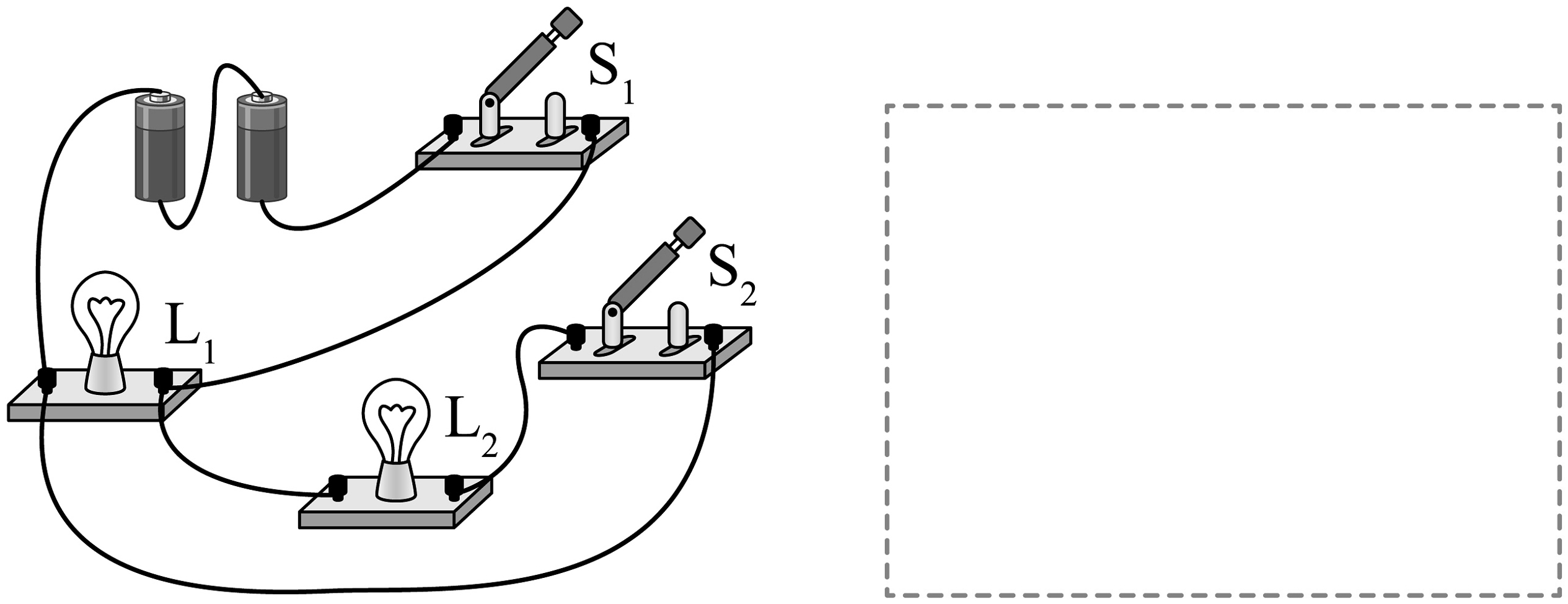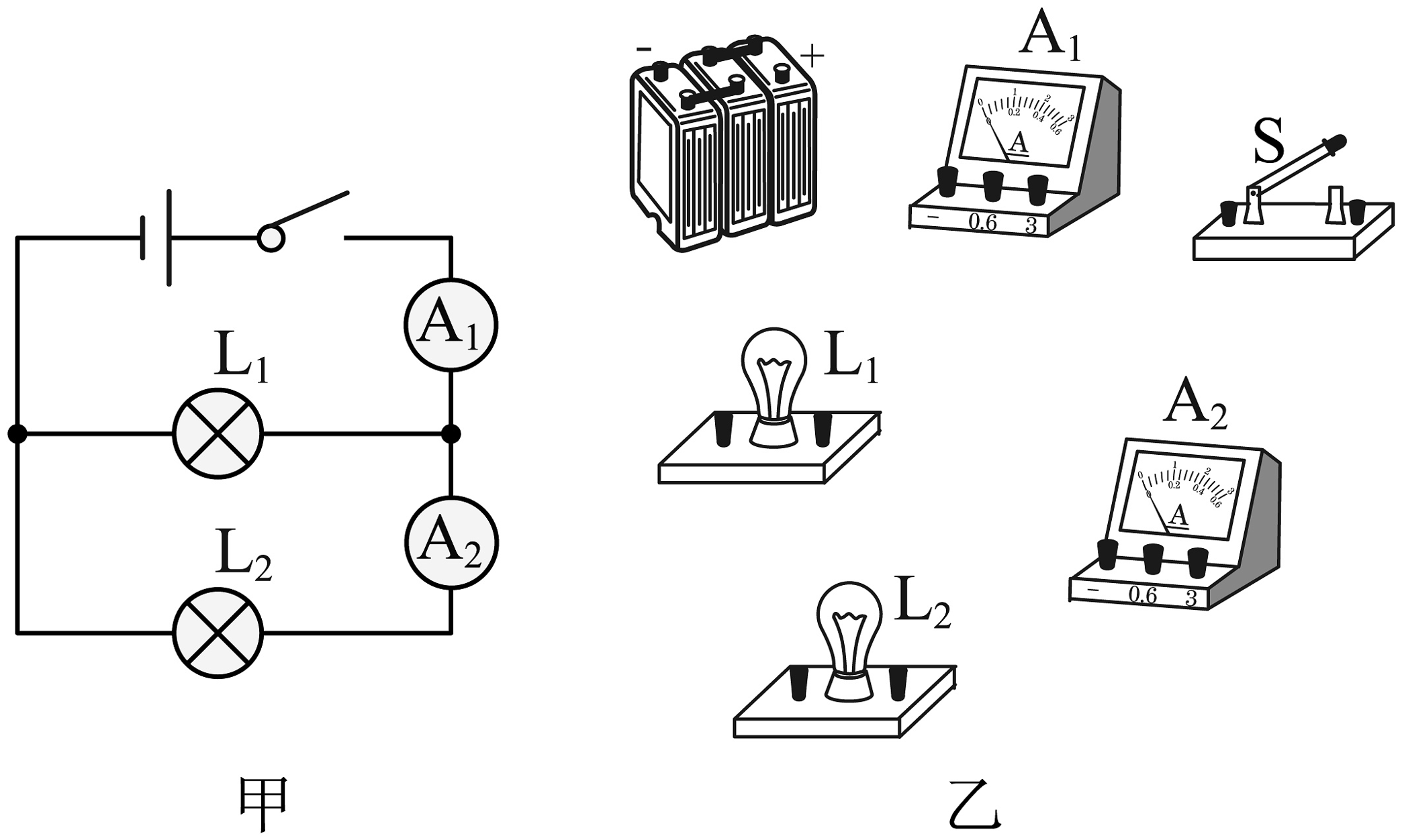 10、作图题:(1)、请根据图中所示的实物图,在虚线框内画出对应的电路图;(2)、如图所示,请在图中的圆圈内填入电流表或电压表的符号,使开关闭合后两灯都能发光;(3)、在如图甲所示,闭合开关后,通过灯泡L l的电流为0.6A,通过灯泡L2的电流为0.3A。试根据图甲将图乙中的实物用铅笔线表示导线连接起来。