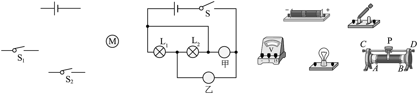 3、作图题:(1)、小伊家买了一辆国产纯电动轿车,其中一个智能设置是车门(车门相当于开关),车的前门和后门中任意一个门没有关好(关好即开关闭合),车辆的驱动电动机M都无法工作行驶。请你在下左图中将这种控制电路图画完整。(2)、如图所示,在○内填入电流表或电压表,闭合开关后,两灯泡都能发光。(3)、用笔画线代替导线,将上右图中元件连接成实物图,要求向左移动滑片,灯泡变亮,电压表测量灯泡两端电压。