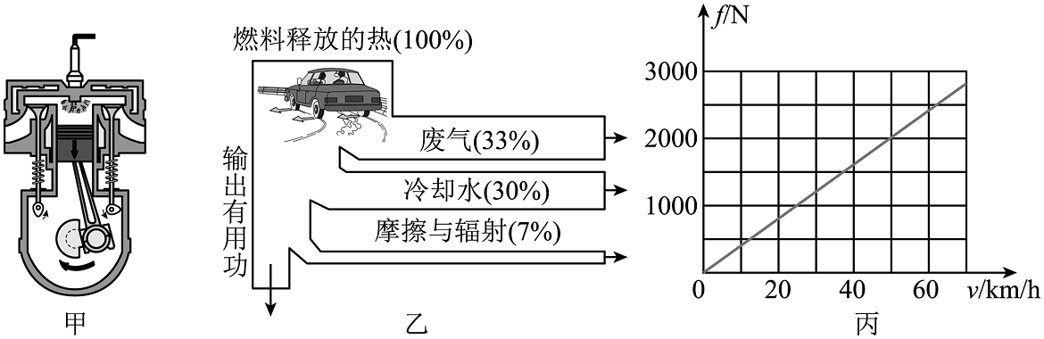 (3)在我国,随着轿车大量的走进家庭,热污染更加严重。汽油机是工农业生产中常用的热机,某型号汽油机的结构如图甲,小白同学阅读了某牌号汽车发动明书后,将内燃机的能量流向制成如图所示的图表乙,该车行驶时所受阻力f和车速v的关系如图丙所示。