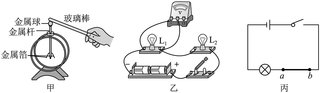 19、按要求完成填空。(1)、如图甲所示,用一个带正电的玻璃棒去接触不带电的验电器的金属球时,金属球也带上正电,这是因为带正电的物体和验电器的金属球之间发生了(选填“正电荷”或“电子”)的转移,同时金属箔张开,其原因是;(2)、如图乙所示,小亮同学在做“研究串联电路中电压的特点”实验中,闭合开关S后,发现电压表的示数接近3 V且两灯泡都不发光,则电路故障是;排除故障后,继续实验的过程中,为了防止偶然因素对实验的影响,应采用(选填“相同”或“不同”)规格的小灯泡进行实验;(3)、如图丙所示,在“探究影响导体电阻大小的因素”实验中,小楠在a、b两点间接入不同导体,通过观察判断导体电阻的大小。若实验中A、B两导体的电阻差别不大,可在电路中串联一个进一步判断两者电阻的大小关系。