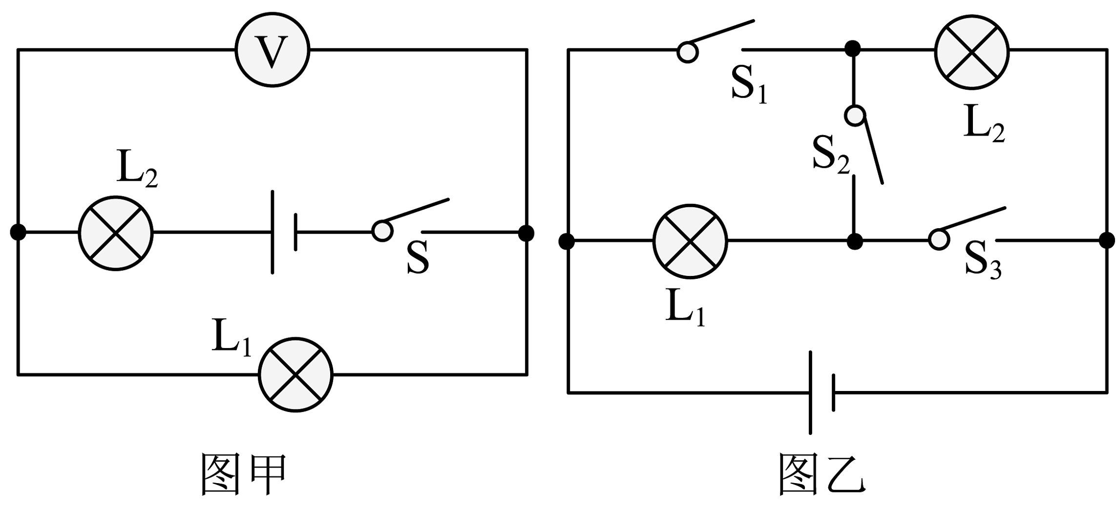 4、如图甲所示,电源电压为4.5V,当开关S闭合时,电压表的示数为1.5V,忽略温度对灯丝电阻的影响,假如灯泡都不会烧坏,则当电源电压变为9V时,L2两端的电压变为V,L1与L2的灯丝电阻之比为;如图乙所示,当开关闭合时,会造成电源短路,应坚决避免。