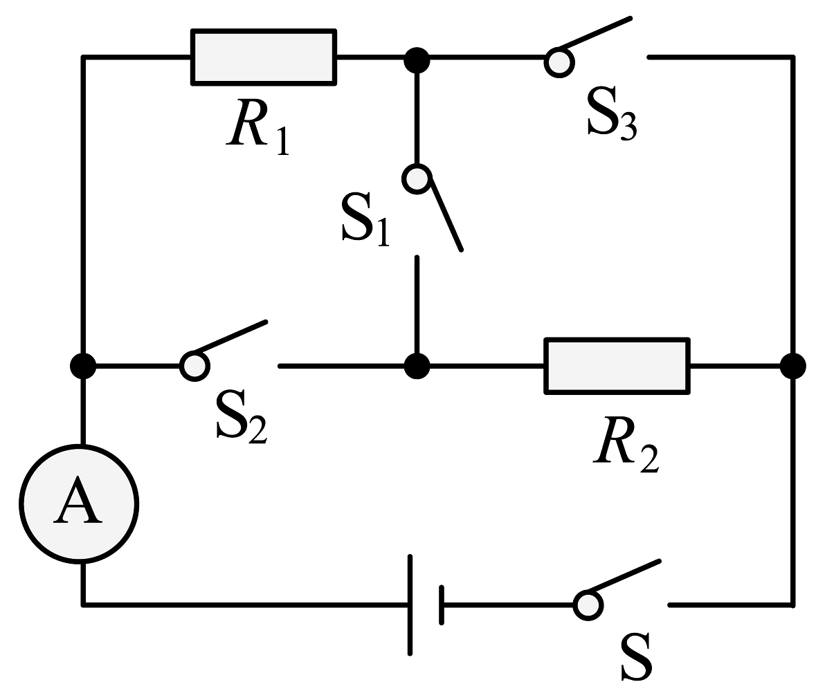 16、如图所示的电路中,当开关 S1、S2断开,开关S、S3闭合时,电流表的示数为0.2A,电源电压为6 V。(1)、当开关S1、 S2断开,开关S、S3闭合时,通过定值电阻 R1的电流为多少?(2)、当开关 S2 、S3断开,开关S、S1闭合时,定值电阻 R1两端的电压为2.5V,此时定值电阻R2两端的电压为多少?(3)、当开关S1断开,开关S,S2 , S3闭合时,电流表的示数为0.75 A,求通过定值电阻R2的电流及定值电阻 R1两端的电压。