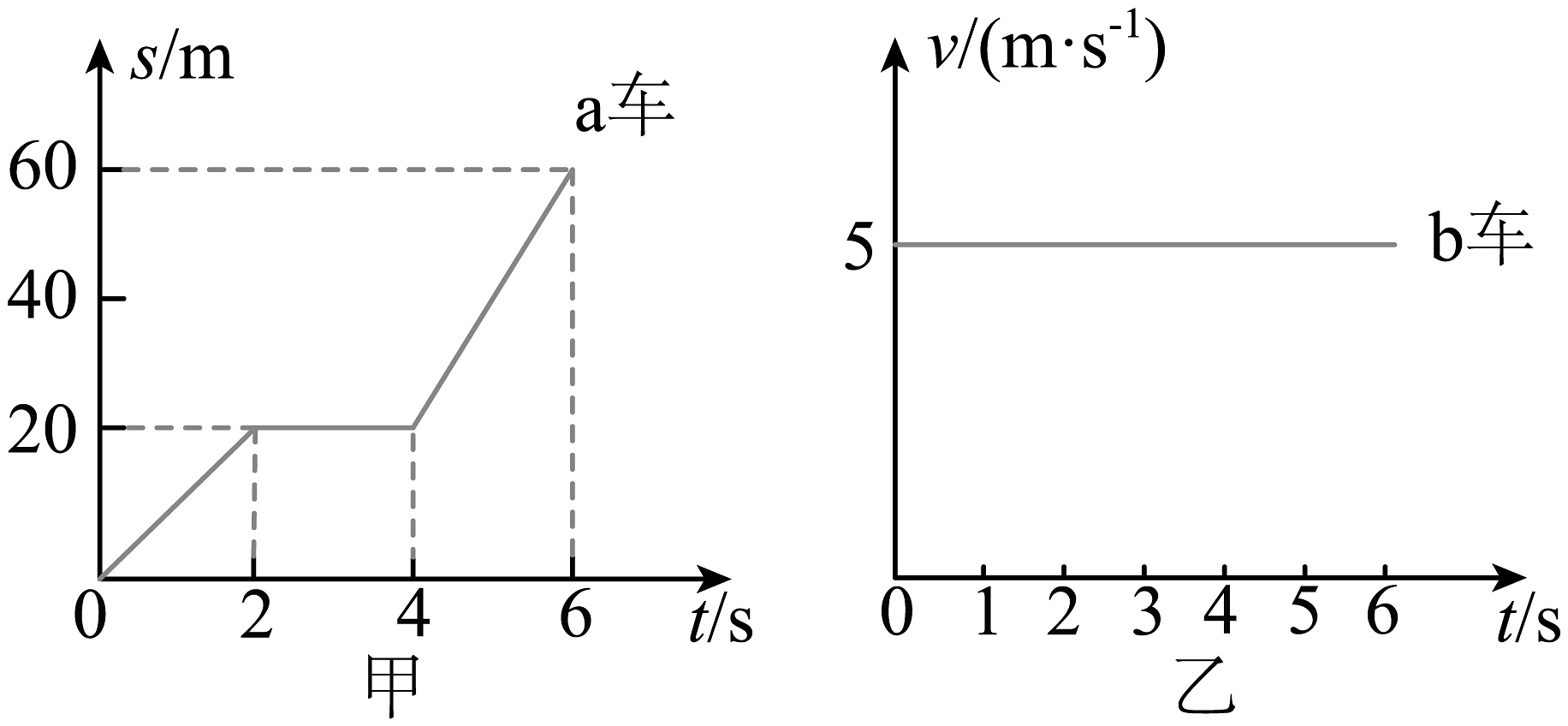 19、a、b两辆小车同时从同一地点出发,沿直线向南运动,图甲是a车运动的s-t图像,图乙是b车运动的v-t图像,下列说法错误的是( )A、内,a和b车都在做匀速直线运动 B、内,a车的平均速度是10m/s C、内,a和b车会有一次相遇 D、内,以a车为参照物,b车向北运动