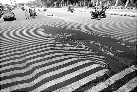 15、因地球环境破坏,全球气候普遍变得恶劣,今年夏天某些区域异常狂热,气温高达50℃,道路开始融化,如图所示,太阳暴晒后的路面材料温度急升,材料内能增大,这是通过方式(选填“热传递”或“做功”)改变了材料的内能;在我国有些古代宫殿中,有许多空心铜柱子支持着宫殿的屋顶,在夏天走进宫殿会感到冷气沁人。原因是空心的铜柱中装进了许多冰块,由于冰块熔化时吸收大量的热使温度降低,而且水的较大,温度不易升高,所以宫殿里很凉爽。