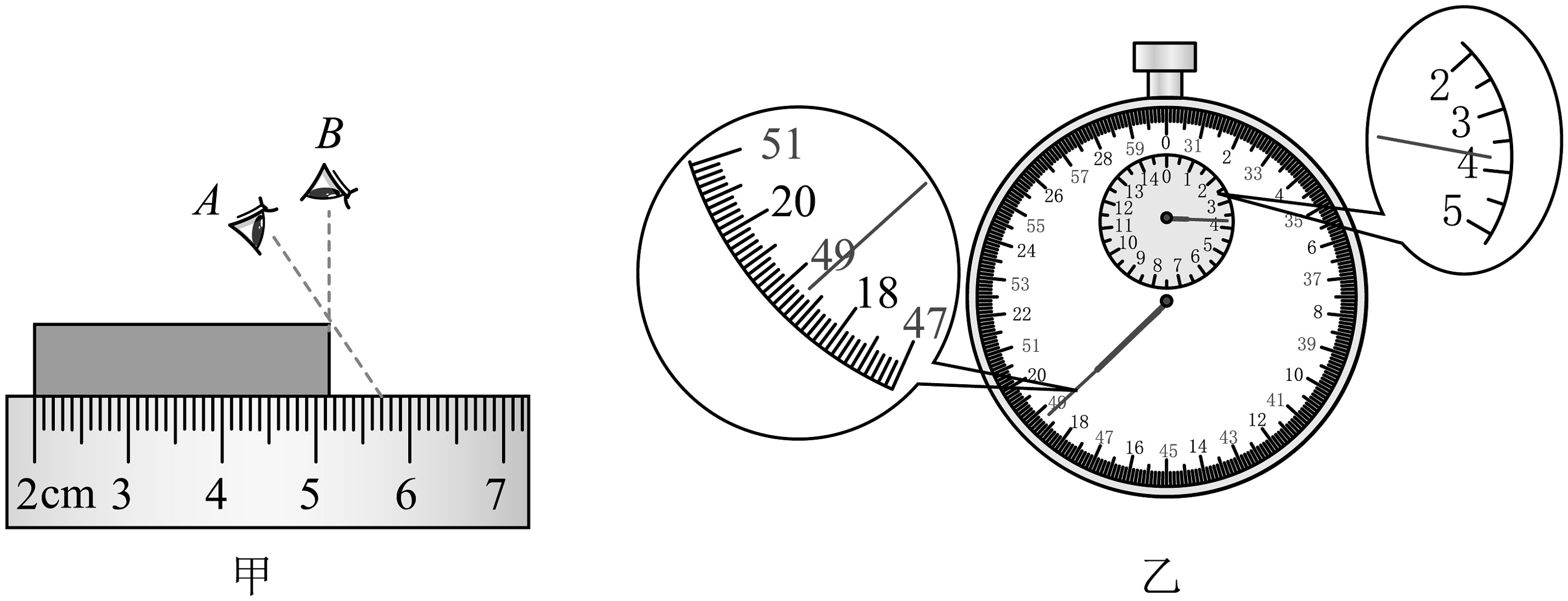 19、如图甲所示,该刻度尺读数时视线正确的是(填“A”或“B”),该物体的长度为cm,图乙是小刚在一次长跑跑步比赛到达终点时秒表的位置示意图,所表示的时间为。