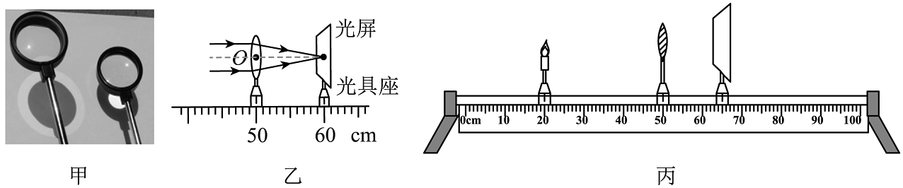 14、小明在“探究凸透镜成像的规律”的实验中:(1)、小明将一个凸透镜和一个凹透镜同时放在阳光下,看到的现象如图甲所示,则(选填“左边”或“右边”)的透镜是凸透镜;(2)、小明让一束平行于主光轴的光线经过凸透镜,移动光屏,某时刻在光屏上找到一个最小、最亮的光斑如图乙所示,则该凸透镜的焦距是cm;(3)、取下平行光源,保持凸透镜的位置不变,把点燃的蜡烛放在光具座20cm刻度线处,移动光屏到65cm的刻度线处,如图丙所示,会在光屏上得到一个清晰的倒立、的实像;(4)、保持蜡烛和光屏的位置不变,此时应将凸透镜移到cm刻度线才能再次得到清晰的像。生活中的就是利用了这样的成像原理;(5)、在第(3)问烛焰成清晰实像的基础上,把一个远视眼镜放在蜡烛与凸透镜之间,光屏上的像变的模糊了,为了在光屏上重新得到清晰地像,同学们想出了一种办法:所有器材位置都不变,换一个焦距更的凸透镜;(6)、实验结束后,他把凸透镜换成一个中间带针孔的硬纸板,其他器材不变,在黑暗的环境能看到光屏上成了像,该成像的原理是。要使光屏上像变大,可采取的操作是。