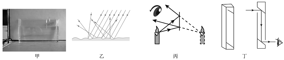 5、关于下面四幅图中所涉及的物理知识,下列说法中正确的是( )A、甲图是一束光在不均匀的糖水中的传播路径,说明光在同种不均匀透明介质中不能沿直线传播 B、乙图中光发生漫反射时的光线看起来杂乱无章,说明光发生漫反射时不遵循光的反射定律 C、丙图是平面镜成虚像的光路图,说明平面镜成的虚像是反射光线反向延长而形成的 D、丁图是潜望镜的光路图,说明潜望镜利用平面镜改变光的传播方向
