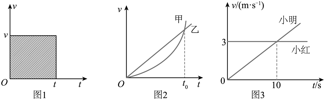 20、在物理学中,常用面积表示某些物理量,如图1所示的图像中,图像与时间轴所围成的面积大小为vt,初中阶段该面积表示物体通过的路程。(1)、现在有甲、乙两个物体由静止开始运动,它们运动时速度随时间变化的图像如图2所示。在时刻,甲通过的路程(选填“大于”、“小于”或“等于”)乙通过的路程。(2)、周日做完作业,小明和小红在海边骑自行车,他们同时从同一地点出发做直线运动,如图3所示是他们的图像,出发后经过s,小明能追上小红。