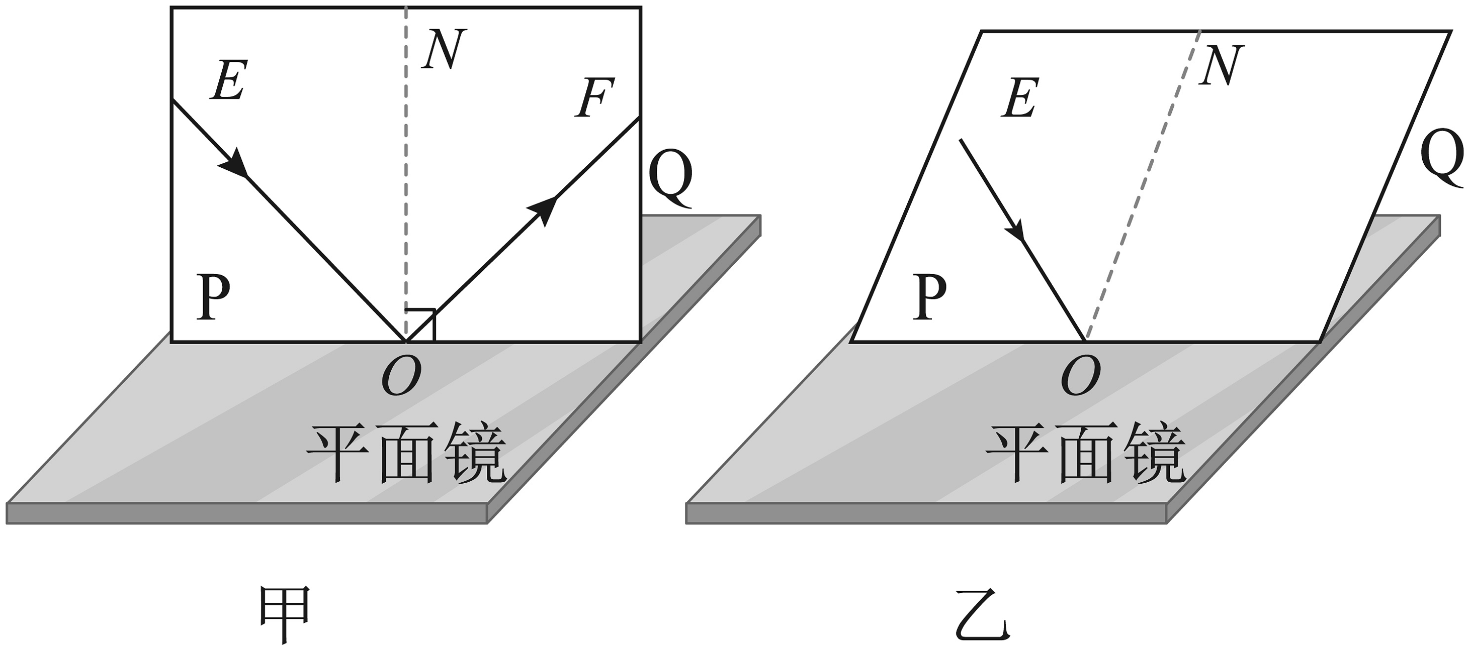 1、在“探究光反射的规律”时,小李进行了如图甲所示的实验(1)、将平面镜平放在水平桌面上,应该选择粗糙的硬纸板作为光屏,硬纸板与平面镜保持如图甲所示,实验中从各个角度都能看到纸板上的光路,是因为在纸板上发生了;(2)、实验时,将一束光贴着纸板P沿EO射到镜面上O点,纸板Q上会显示出反射光束OF。接着将纸板Q绕ON向前或向后翻折,则纸板Q上 (选填“能”或“不能”)显示出反射光束,由此说明反射光线、入射光线与法线在同一平面内,在纸板Q绕ON向后翻折的过程中,反射光线的位置(选填“改变”或“不变”);(3)、若保持平面镜位置不变,将纸板向后倾斜一个角度(如图乙),入射光线仍能呈现在纸板上,且沿EO方向入射到平面镜的O点,此时(选填“能”或“不能”)在纸板上看到反射光线,此时反射光线、入射光线和法线(选填“在”或“不在”)同一平面内;(4)、小明同学的实验数据如表所示,他根据表中数据得出的结论和其他同学的结论并不一致,请你分析小明测量实验数据过程中出现的问题可能是订正错误后,可以得到的结论是:。