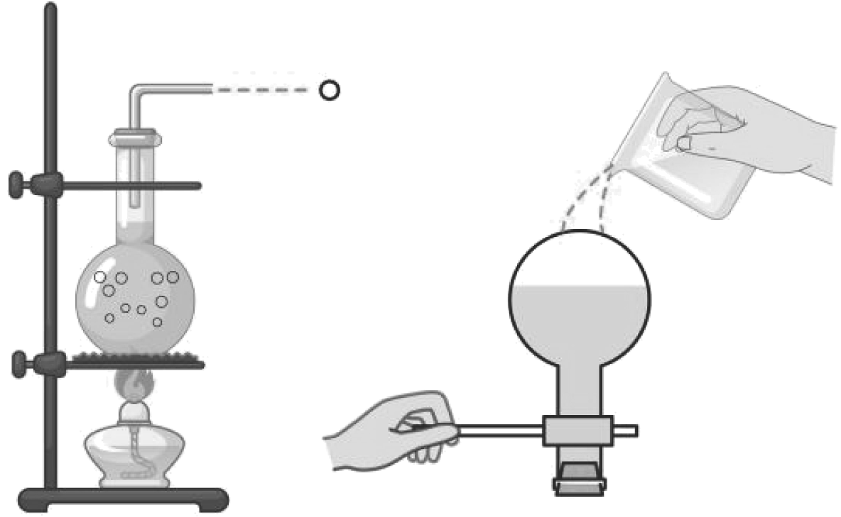 (2)、分析实验数据或图像可知,水的沸点为℃;水沸腾前温度不断升高,沸腾后温度;(3)、小明在实验中观察到水中气泡上升情况如图丙所示,其中图(选填“A”或“B”)是水沸腾时的现象;(4)、若按图丁所示装置用烧杯中的水为试管中的水加热,试管中的水(选填“能”或“不能”)沸腾。(5)、如图所示,用酒精灯将烧瓶内的水加热沸腾后,在离管口稍远处可以看到“白气”,这是(填写物态变化名称)现象;撤去酒精灯,用橡皮塞塞紧瓶口,用冷水浇瓶底(如图),瓶内的水会再次沸腾,这是因为烧瓶内水面上方气压减小,水的沸点(选填“升高”或“降低”)。 -