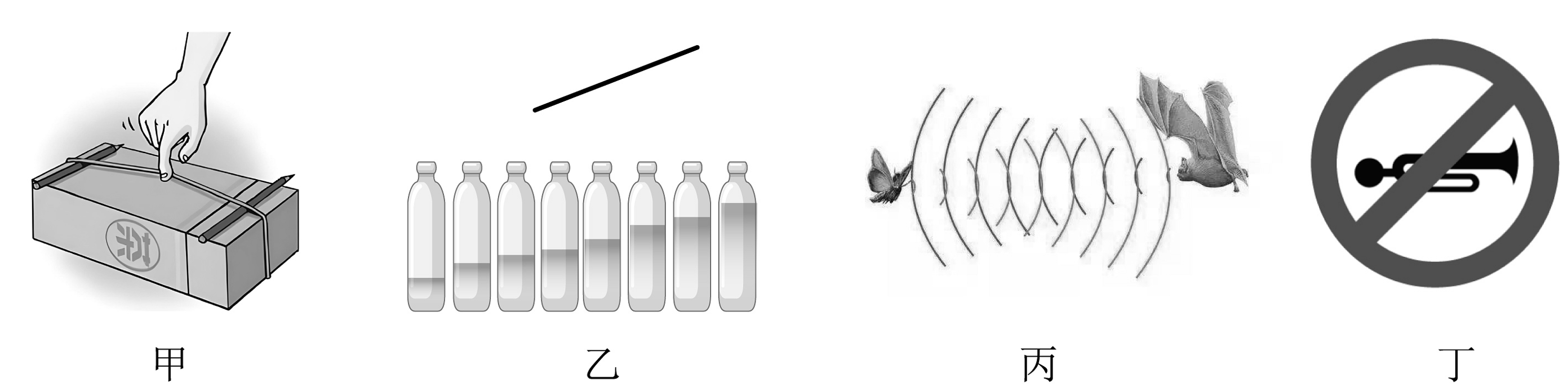 15、下列关于声现象的描述和分析,正确的是( )A、图甲:拨动绷紧的橡皮筋,橡皮筋振动发出声音 B、图乙:用相同的力敲击水瓶琴能发出音调不同的声音 C、图丙:蝙蝠利用次声波传递能量确定目标的位置 D、图丁:禁止鸣笛是在传播过程中控制噪声的