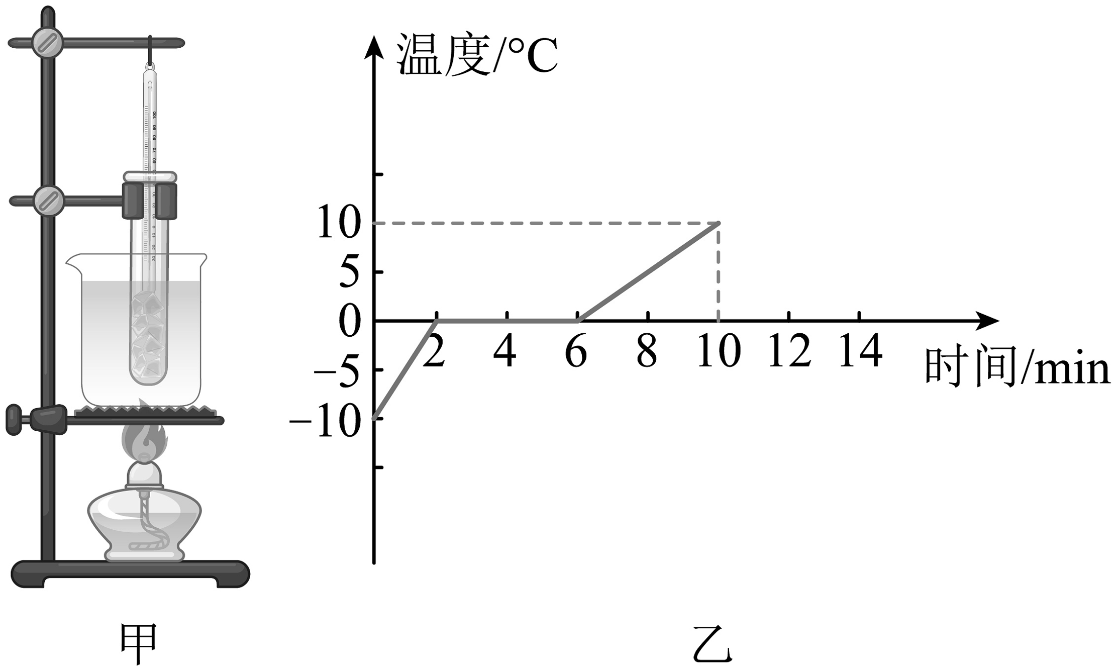 5、图甲是“探究冰的熔化特点”实验装置,图乙是根据实验数据描绘出冰在熔化时温度随时间变化的图像。(1)、为了顺利完成实验,除图甲中所示的器材之外,还需要补充的测量工具是;(2)、由图乙可知,冰的熔点是℃;在第分钟至分钟,试管内物质处于固液共存状态;(3)、小明将少量碎冰放入试管中,没有任何加热措施就能明显观察到有一部分冰熔化了。他认为冰的熔化不需要吸热。你同意他的看法吗?说说你的理由。(4)、冬天,室外已结冰。某同学把酒精和水的混合液体放到室外(温度大约为),经过相当长时间后,却发现混合液体没有凝固。针对这个现象你能提出什么猜想?