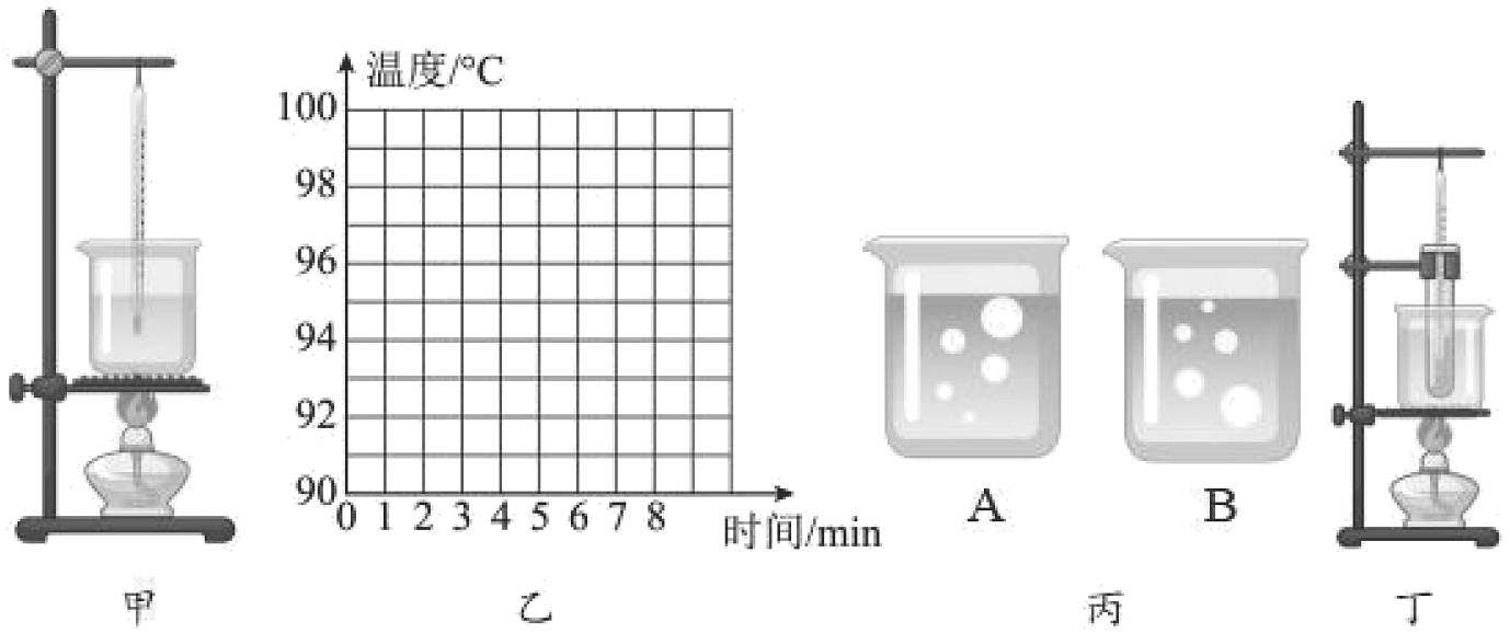 4、小明用图甲装置“探究水沸腾前后温度变化的特点”。(1)、小明记录的实验数据如下表,请根据表格数据在图乙中描点后画出水沸腾前后温度随时间变化的关系图像;