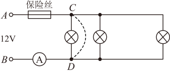 17、小明同学为了探究家庭电路中保险丝熔断的原因,做了如下实验。他用若干“12V 0.5A”的灯泡作为用电器,12V的铅蓄电池代替家庭照明电路的电源,电源的正极代替火线。在正极与用电器之间接入一段保险丝,在负极与用电器之间接入一块电流表(如图所示)。(1)、由于人体的安全电压大小是不高于 , 小明实验时用的电源只有12V,所以可确保实验的安全性。(2)、小明依次在电路中接入几个小灯泡,当接入两个小灯泡时,灯泡可以正常地工作,此时电流表的示数为A;当他再接入一个小灯泡时,发现保险丝熔断,此时电路中的电流变成0,该实验可以验证保险丝熔断原因是 。(3)、小明只让一个小灯泡工作,在C、D两点间接入一段导线,他发现保险丝会马上熔断,此时保险丝熔断的原因是 。