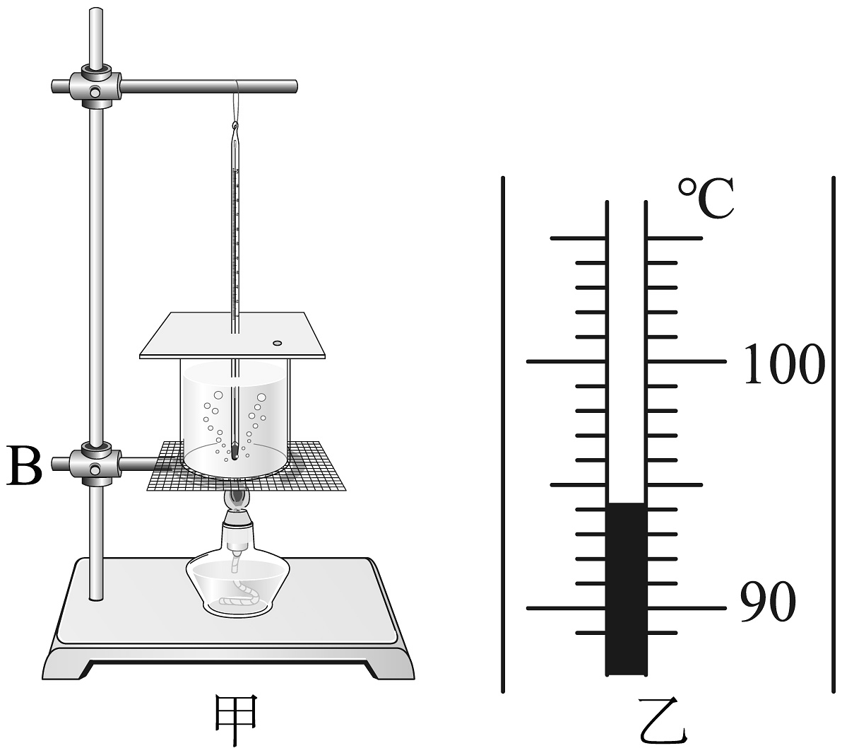 15、小明探究“水沸腾前后温度变化特点”的实验装置如图甲所示。(1)、在安装实验器材时,应先调节并固定铁圈B在“适当”位置,这里的“适当位置”是指。(2)、观察可以发现,图甲中实验仪器的组装存在一处明显的错误,该错误是。(3)、纠正错误后,用酒精灯给水加热,观察水温和水中气泡的变化情况,图乙是实验中某一时刻温度计示数,其读数是℃。