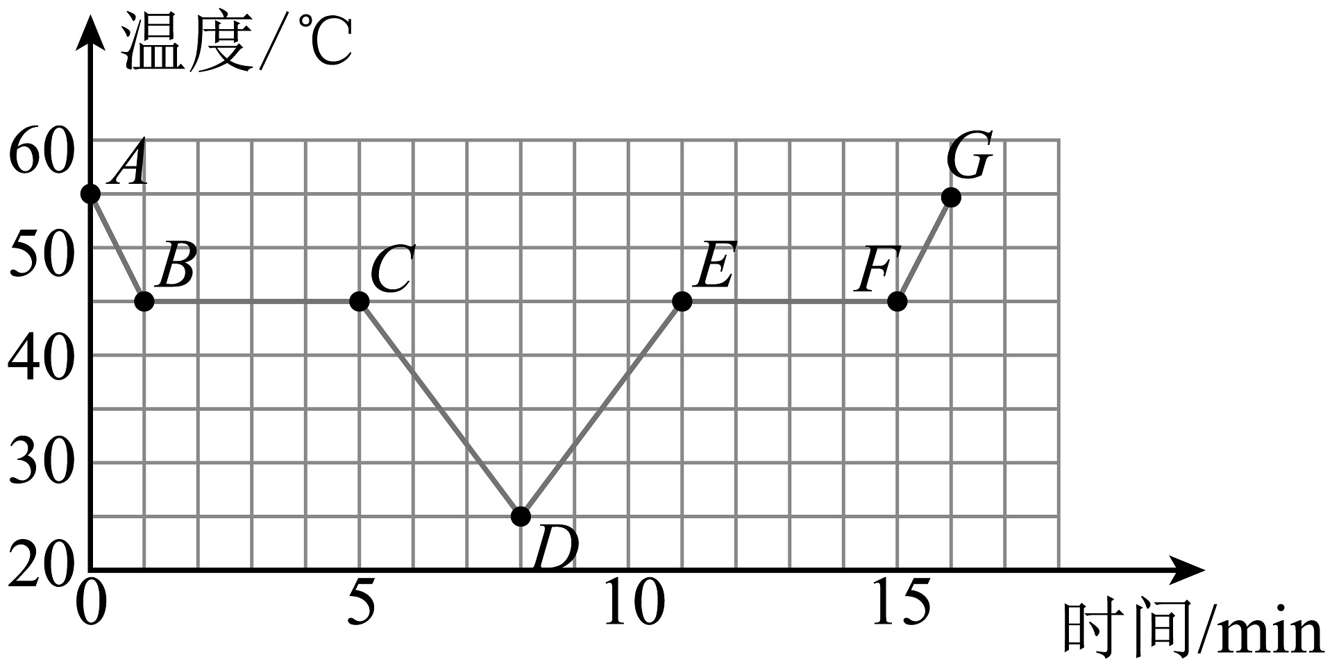3、如图为某物质的凝固与熔化过程中温度变化图像,下列判断正确的是( )A、图像中的EF段表示熔化过程 B、该物质的固体为晶体,熔点为55℃ C、该物质在BC段吸收热量 D、该物质熔化过程时间为5min