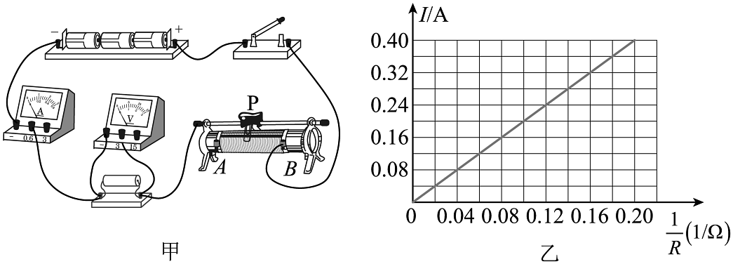 5、小明在“探究电流与电阻的关系”实验中,设计了如图甲所示的电路。电源电压恒为4.5V,备有阻值分别为5Ω、10Ω、25Ω、50Ω的定值电阻各一个。(1)、设计实验时,小明制定了探究思路:保持定值电阻两端电压不变,改变定值电阻阻值,探究电流与电阻的关系。物理上把这种科学探究的方法叫做;(2)、在“探究电流与电阻的关系”的过程中,小明设定定值电阻两端的电压为2V,要想使以上所有定值电阻都能为该实验所用,滑动变阻器的最大阻值不能低于Ω;(3)、小明选择了阻值合适的滑动变阻器,先用5Ω电阻实验,闭合开关,调节滑片P,使电压表示数为2V,并记录此时电流表的示数;断开开关,将5Ω电阻换成10Ω,闭合开关,在原来位置基础上将滑片P向(选填“A”或“B”)端适当移动,使电压表示数为2V,记录此时电流表的示数;(4)、更换其余电阻继续实验,根据4组数据作出图像如图乙所示;分析图像可得出:。