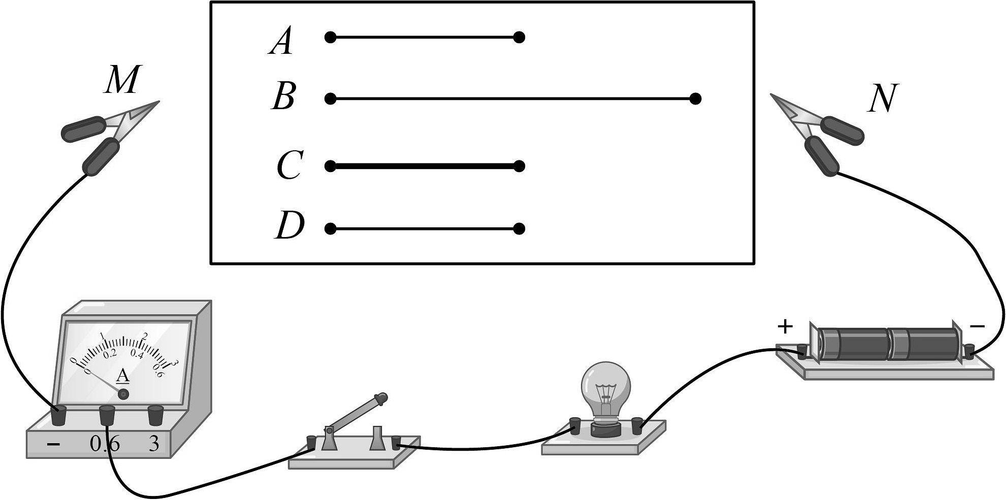 (1)、为了验证上述猜想①,应该选用编号为两根电阻丝进行实验;如果选用编号为A、C两根电阻丝进行实验,是为了验证猜想(填序号);如果选用编号为A、D两根电阻丝进行实验,是为了验证猜想(填序号);(2)、有同学认为,可以根据灯泡亮度的变化来判断接入的电阻丝阻值的变化情况。老师指出:此实验中这种方法不可取。这是因为电源电压一定时,所选电阻丝的阻值相差太小,灯泡亮度变化(选填“明显”或“不明显”)。 -