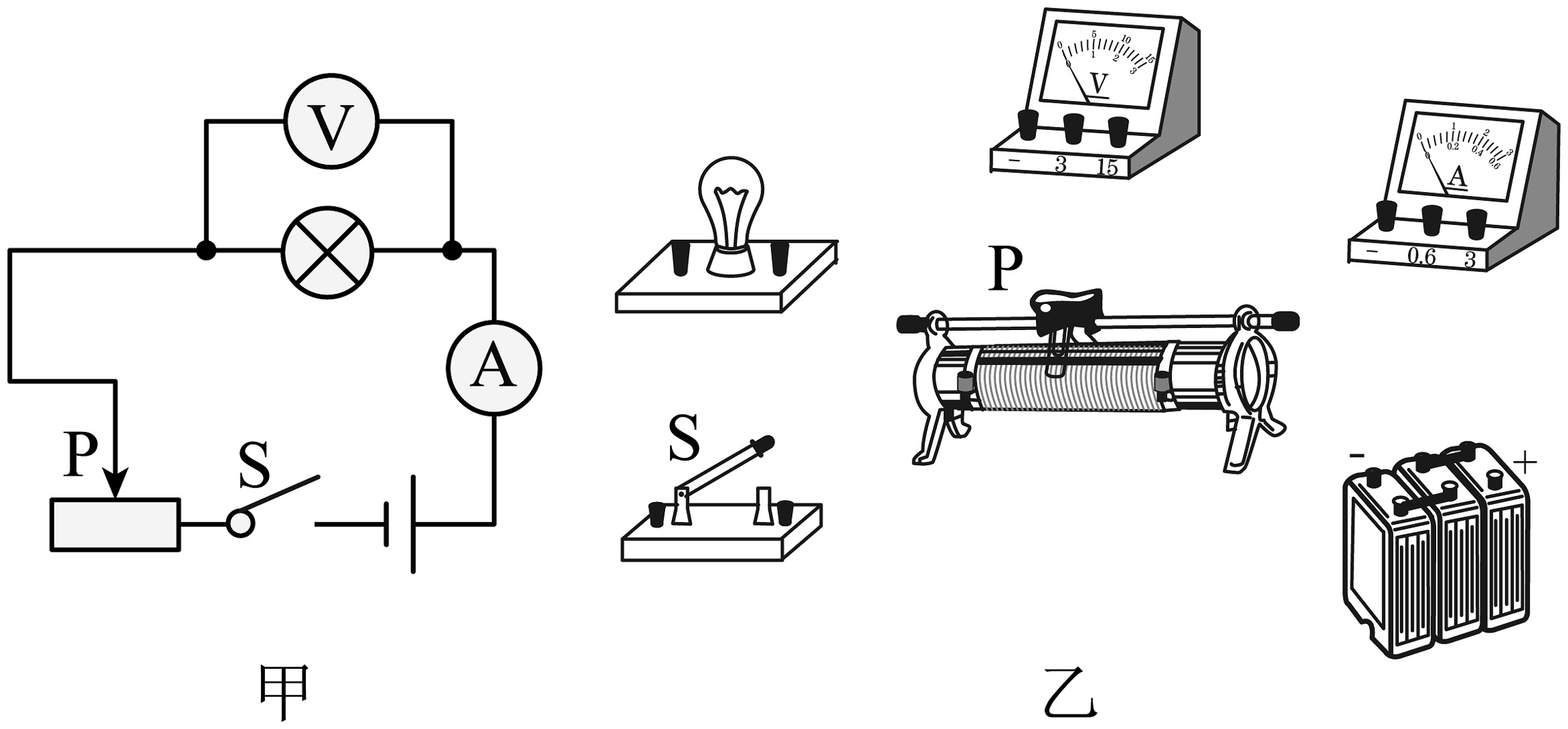 8、请按照图甲所示的电路图,连接图乙中的实物元件。(电压表选用0~3V量程,电流表选用0~0.6 A量程)
