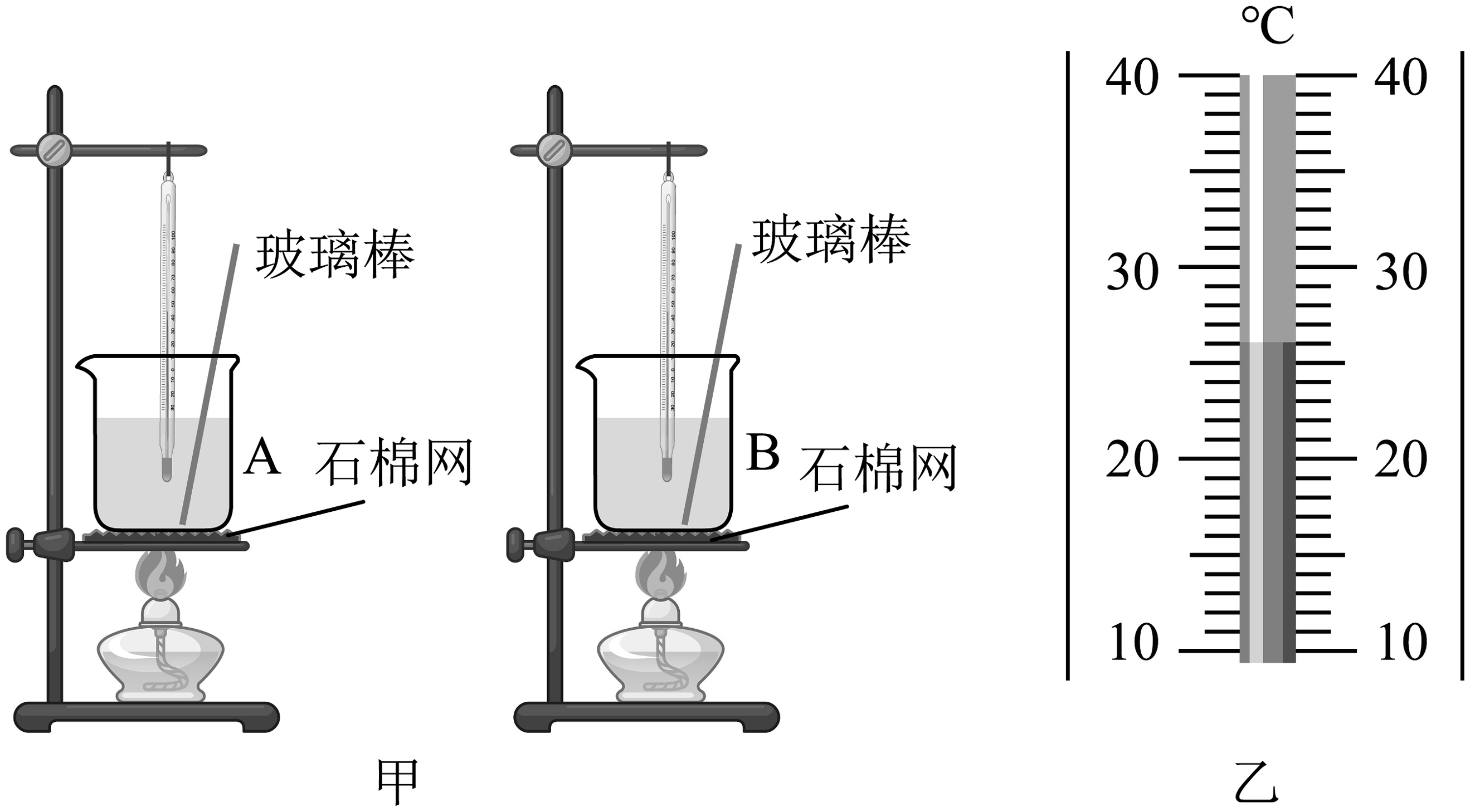 13、图甲是小明做“比较不同物质吸热情况”实验的装置,他用两个相同的容器分别装入质量相等的A、B两种液体,并用相同的装置加热。