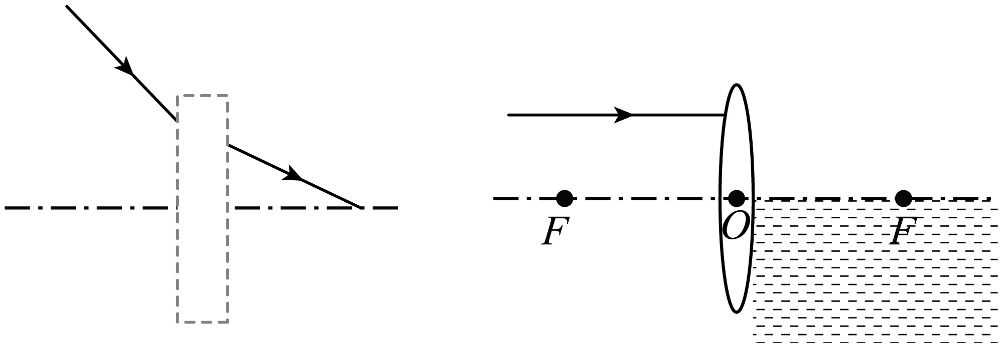 15、作图题:(1)、请在图中画出光经过透镜后的折射光线。(2)、①根据光的传播路径,在图中的虚线框内,画出符合要求的透镜。②如图所示,一束光射向凸透镜经折射后射到水面,请在图中画出光经过凸透镜的折射光线和水中的折射光线的大致方向。