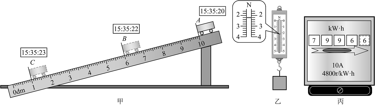 1、如图所示,图甲中小车从A到C通过的路程是cm,图乙中弹簧测力计的示数是N,图丙中若电能表的转盘在10s内转了12转,则该电路消耗的电功率是W。