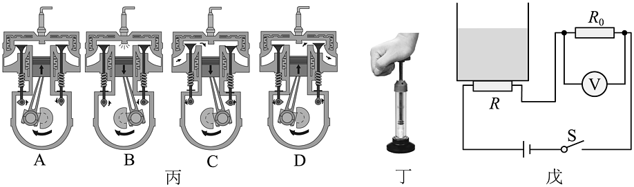 (2)、通常所说的混合动力汽车,一般是指油电混合动力汽车,采用传统的内燃机(柴油机或汽油机)和电动机作为动力源。该混合动力汽车启动时,内燃机不工作,车内蓄电池输出能量;当高速行驶或蓄电池储存电能过低时,内燃机启动,既可以向车轮输出能量,同时又可以向蓄电池充电;当车辆需要全力加速时,内燃机、蓄电池可以同时向车轮输出能量。①图丙为四冲程内燃机的各冲程的示意图,(填字母)为吸气冲程。如图丁所示,用力将活塞迅速下压,筒内硝化棉燃烧,该过程能量转化的特点与图丙中图(填字母)的冲程能量转化相同;