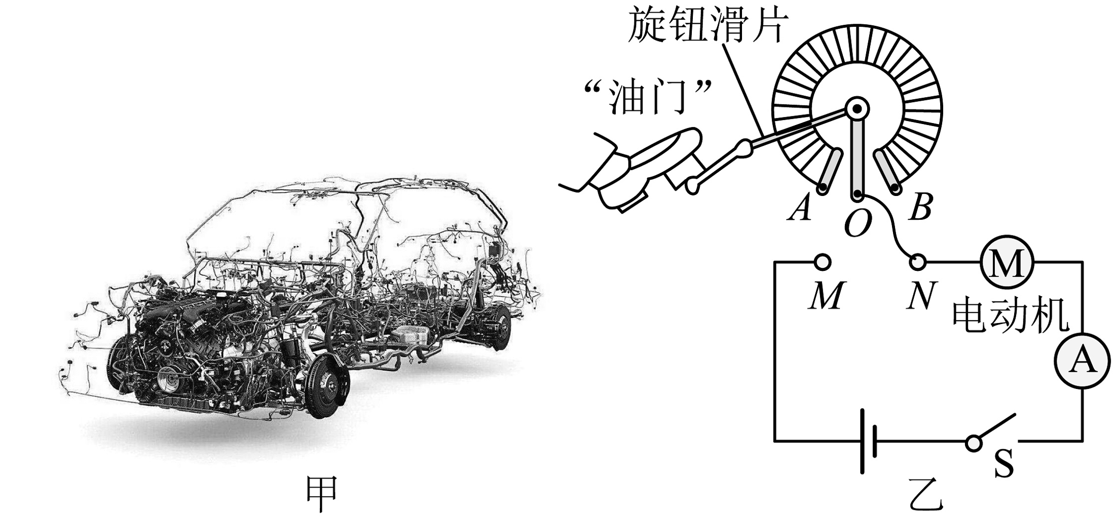 ④汽车中电动机的转速由电流大小控制,工作原理如图乙。利用旋钮变阻器实现对转速的控制,图中O、A、B为变阻器的三个接线柱。驾驶员踩下“油门”时,电流变大而加快电动机的转速,用笔画线代表导线完成电路连接。