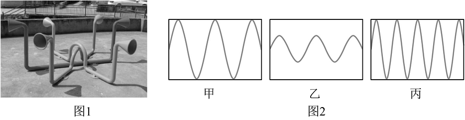 7、儿童公园中设置了如图1金属管做的传音筒,有图2甲、乙、丙三个声音分别从同一根金属管这边喇叭传到另一头的喇叭位置,声音在金属管中传播的路径相同,甲乙丙三个声音在同一设置的示波器中显示的波形图如下,下列说法正确的是( )A、乙声音传播时间最长 B、另一头听到的甲丙声音的音色相同 C、这个装置只利用了金属管来传播声音 D、甲声音比乙声音的频率高