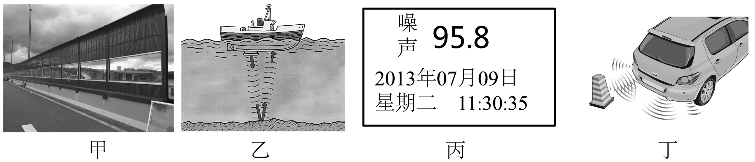 8、如图所示,关于声现象,下列说法正确的是( )A、甲图:在靠近居民区的路段设置的声音屏障,目的是在声源处减弱噪声 B、乙图:利用超声可以探测海底深度,说明超声波在海水中的传播速度大于其他声波 C、丙图:城市中的噪声测试仪,数字95.8后的单位应该是Hz D、丁图:汽车安装的倒车雷达,是利用超声波反射来定位的