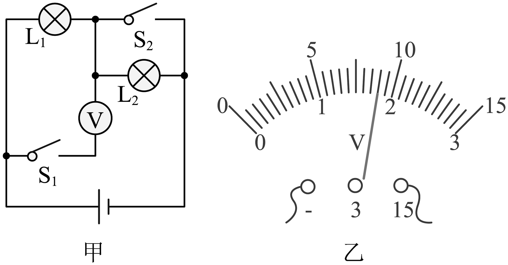 8、如图甲所示的电路中,电源电压不变。当开关S1、S2均闭合时,电压表的示数如图乙所示;当开关S1闭合,S2断开时,电压表的示数为3V。求解下列问题:(1)、当开关S1、S2均闭合时,灯L2两端的电压为多少?(2)、电源电压为多少?(3)、当开关S1闭合,S2断开时,灯L2两端的电压为多少?