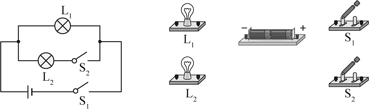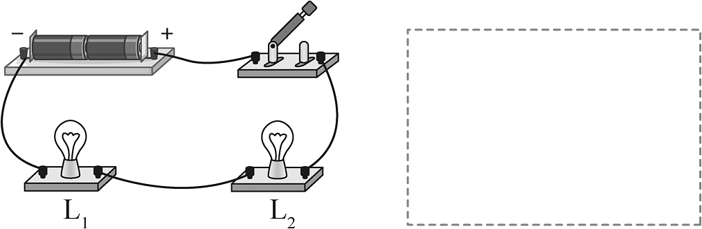 9、(1)、请按照如图所示的实物图在虚线框中画出电路图。(2)、请根据电路图,用线代替导线连接实物图。(导线不能交叉!)