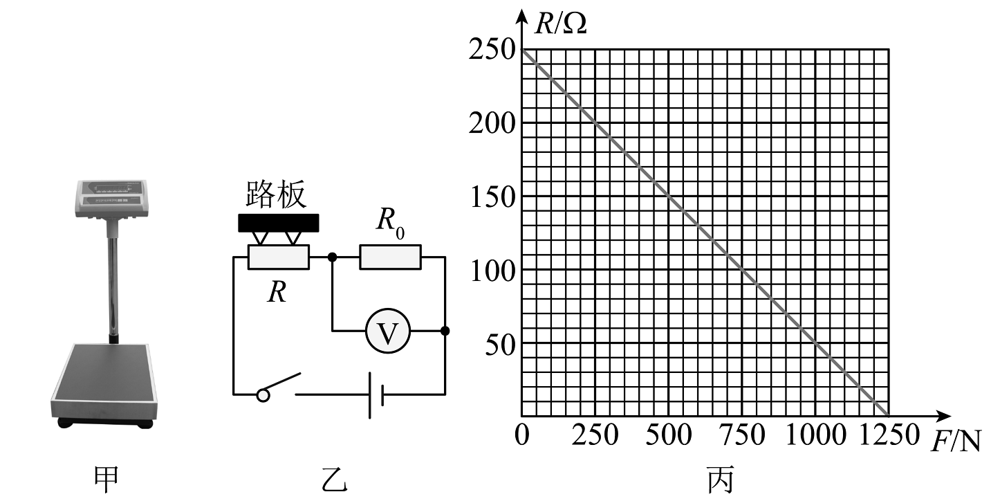 8、如图甲是某型号电子秤,其原理结构如图乙所示。R0为定值电阻,R是压敏电阻,其阻使随所受压力F变化的关系如图丙所示,改写电压表(量程为3V)的表盘数值后可直接读出所称物体的质量。设踏板的质量为5kg,电源电压保持9V不变。g取10N/kg。