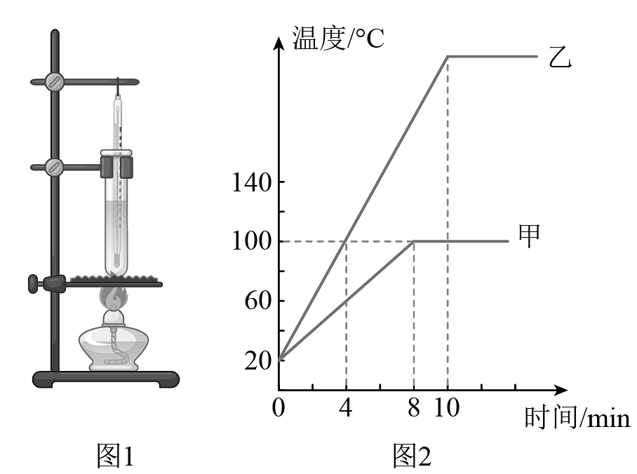 19、如图1所示,小明用同一个实验装置分别加热质量均为50g的甲、乙两种液体(其中一种是水),用先后测得的数据绘制了温度随时间变化图象如图2所示,乙液体从20℃加热至沸腾刚好消耗了2g酒精()。若单位时间内甲、乙液体吸收的热量相等, , 则下列说法中正确的是( )A、甲的吸热能力小于乙的吸热能力 B、0~8min乙吸收的热量为 C、该酒精灯的加热效率为35% D、乙的比热容为