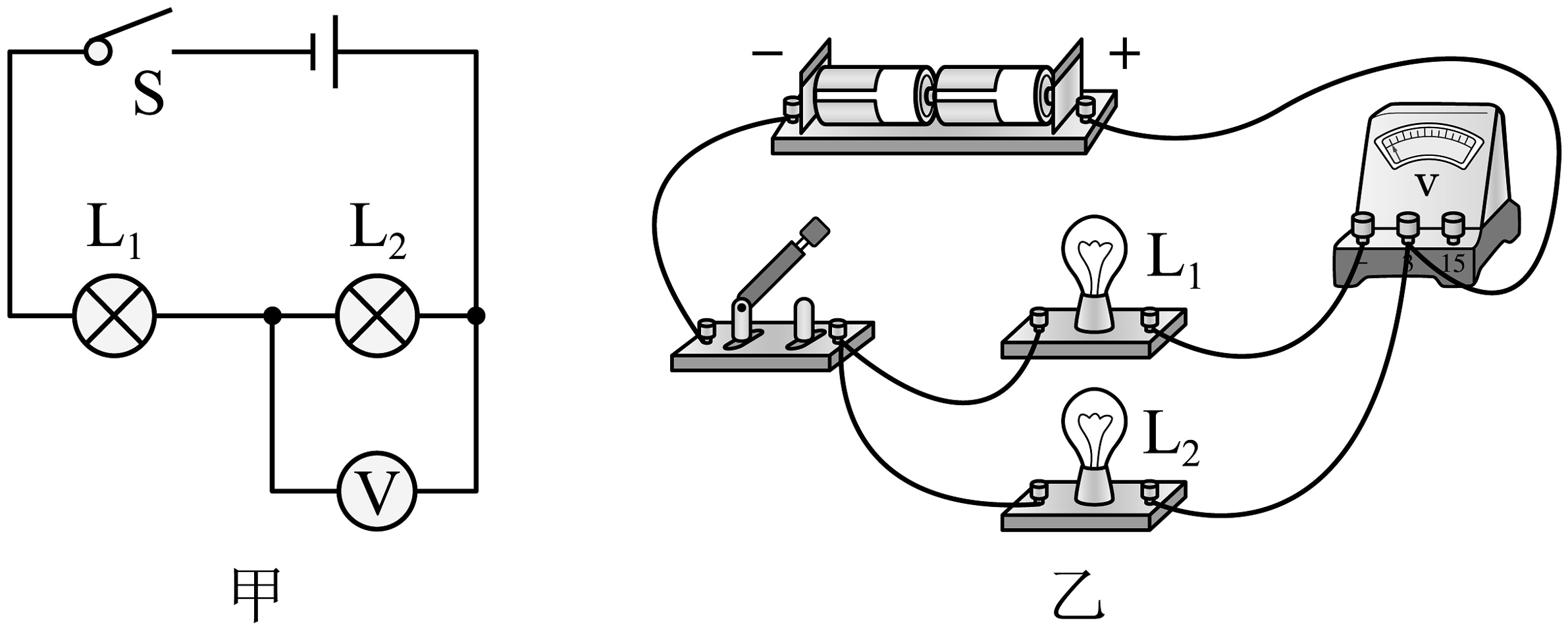 3、小明用甲图中的电路图探究串联电路中电压的规律:(1)、连接电路时,开关应处于状态;(2)、测量灯泡L2的电压时,小明连接了如图乙所示的电路,闭合开关,小明发现电压表的示数始终为3V,检查后发现只有一根导线连接错误。请你在错误的导线上打×,再用笔画出正确连接的导线;(3)、正确连接电路后再次闭合开关,若电压表的示数为电源电压且L1不亮,则故障可能是(故障只发生在灯泡上);(4)、用电压表分别测出L1、L2和电源两端的电压,用U1、U2、U表示。接着更换不同规格的灯泡并多次实验,数据记录如下表: