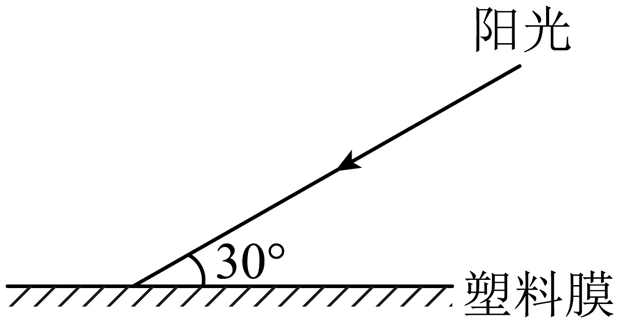 11、如图所示,阳光照射在透明塑料膜局部一个近似平整的表面,请你通过作图画出对应的反射光线,并标出反射角的大小。