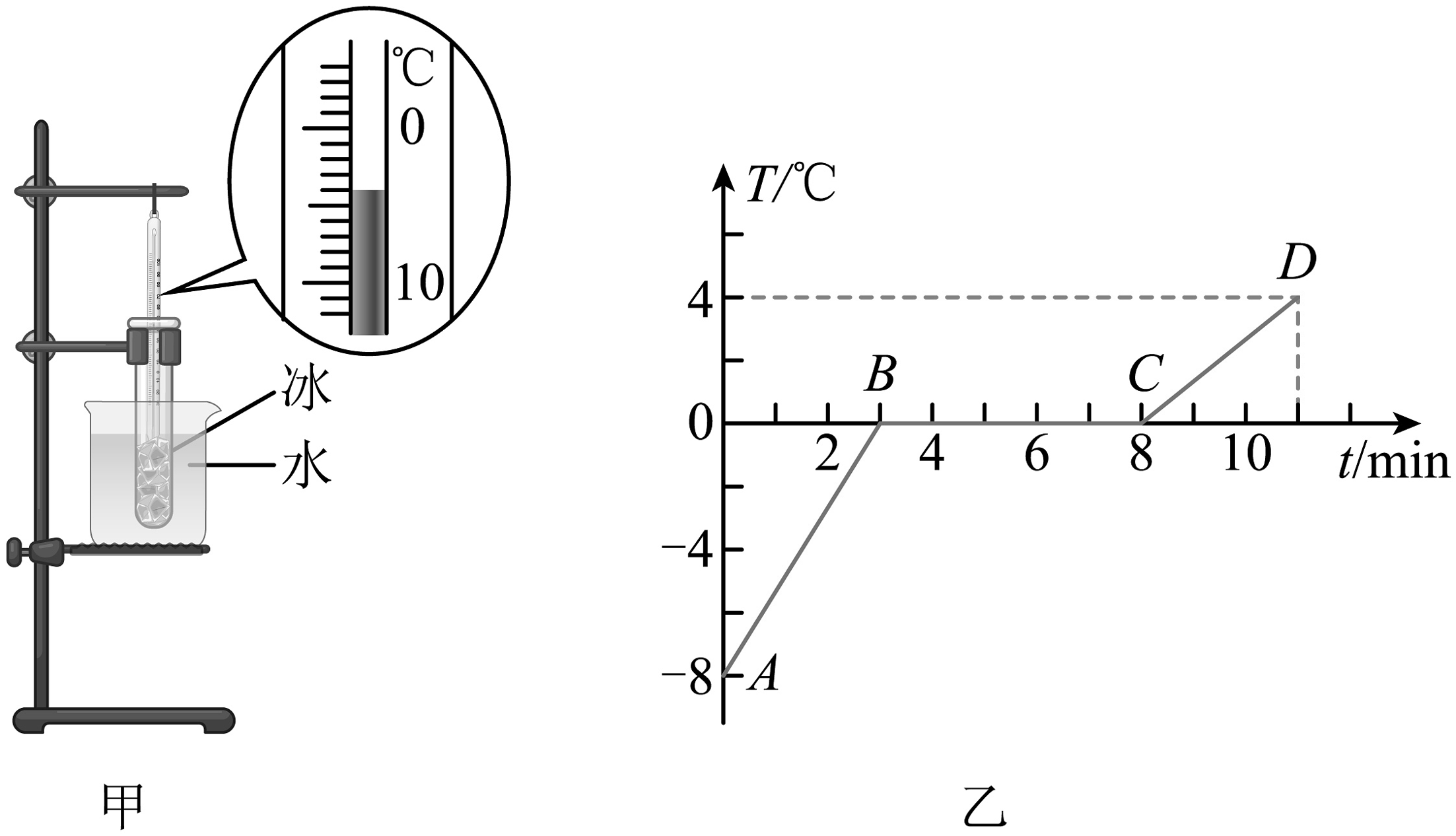 14、在“探究冰熔化时温度的变化规律”实验中,小丽同学设计了如图甲所示的实验装置。(1)、在安装实验器材时应按照(填“自上而下”或“自下而上”)的顺序进行;(2)、实验过程如图甲所示,此时试管中冰的温度为 ℃;(3)、小丽根据实验数据作出的冰在加热时温度随时间变化的图像如图乙所示,分析图像可知冰是(选填“晶 体”或“非晶体”);加热至第4min时,物质的状态为 态。