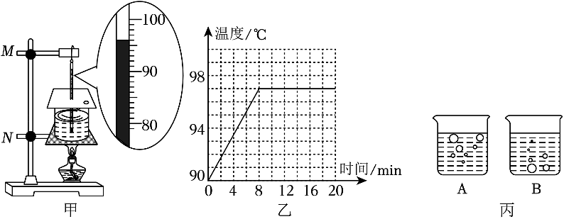6、在做“探究水在沸腾前后温度变化的特点”实验时,某同学使用的实验装置如图甲所示,根据实验数据作出的“温度—时间”图象如图乙所示。(1)、在组装装置甲时,要分别调节铁夹M和铁圈N的高度,应首先调节的是(填“M”或“N”)的高度,图甲中温度计的示数为℃;(2)、由图乙可知,实验时水的沸点是℃;(3)、在实验中发现如图丙A、B所示的两种情形,其中图是水在沸腾时的情况;(4)、实验时,为了缩短加热时间,还可以采取的措施是。(写出一条即可)