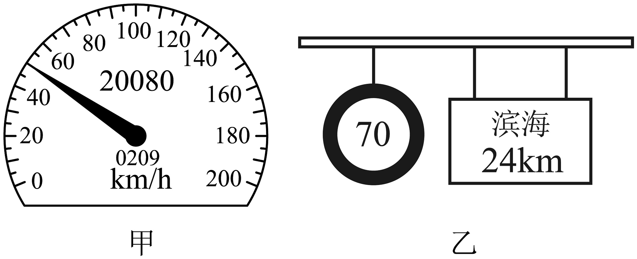 3、暑假期间某同学乘车沿北海路去海边游玩,所乘汽车的速度表如图甲所示,他看见路边一个交通标志牌,则:(1)、标志牌上“滨海 24km“表示的物理意义;(2)、所乘汽车的行驶速度;(3)、某次汽车以72km/h的速度向对面高山驶去,在司机鸣笛后4s听到了回声,求鸣笛之前汽车到高山的距离。(声音在空气中的传播速度是340m/s)